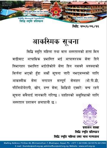अस्पतालले अर्को सूचना जारी नभएसम्मको लागि आकस्मिक सेवा लगायत सम्पूर्ण सेवाहरु (ओ.पी.डी. फिजियोथेरापी, खोप, दन्त सेवा, भिडियो एक्सरे) बन्द रहने जनाइएको छ ।