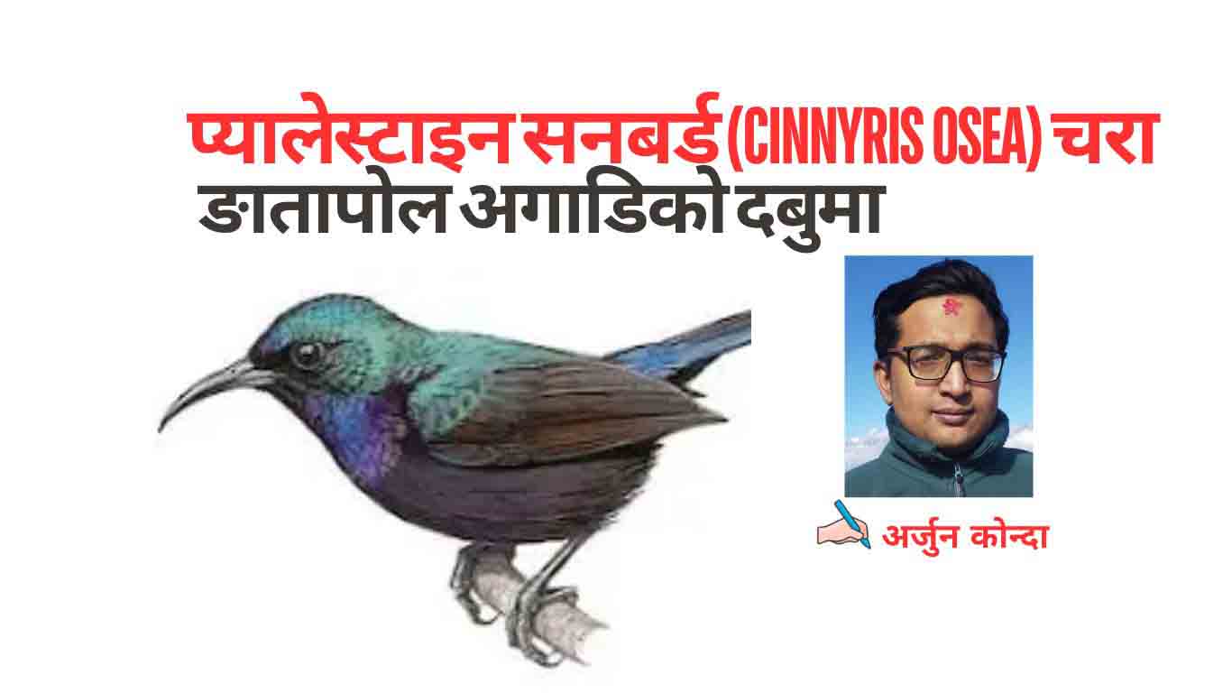 मन व्याकुल भयो । कल्पनाको संसारबाट बाहिर आई गुगलमा खोजेँ । त्यो त सन् २०१५ मा घोषणा गरिएको प्यालेस्टाइनको राष्ट्रिय सुनौलो चरा अर्थात प्यालेस्टाइन सनबर्ड पो रहेछ । उच्च तापक्रम र सुख्खा हावापानी भएका क्षेत्रमा समुद्री सतहदेखि ३२०० मिटरको उचाइमा प्यालेस्टाइन, इजरायल र जोर्डन मात्र नभई साउदी अरेवियादेखि यमन र ओमानमा समेत उडान भर्ने ती प्यालेस्टाइनियन सनबर्ड (Cinnyris osea) को एक सानो पासेरिन चरा परिवार मध्य पूर्वबाट कसरी नेपाल आए भन्ने मैले बुझ्नै सकिनँ । अनि मैले यो पनि बुझ्न सकिनँ कि उडान भर्दा कति संख्यामा आएका थिए र नेपालमा कति चरा आइपुगे ? किनकी आजभोलि त्यो प्यालेस्टाइन सनबर्ड उड्ने प्यालेस्टाइनी आकाशमा चराहरु उड्न निषेध छ । प्यालेस्टाइनको मुटुमा बस्ने प्राकृतिक सौन्दर्य र इजरायलविरुद्ध प्रतिरोधको प्रतीक त्यो चरा अब खुलेर उड्न सक्ने स्थिति छैन । न त प्यालेस्टाइनी भूमिमा बिरुवाहरुको प्रजननमा सघाउ पु¥याउन परागसेचन कार्य गर्न सहज छ । प्रत्येक दिन प्रत्येक रात इजरायली दुष्ट सेनाबाट परिचालित गोला, बारुद र मिसाइलले सनबर्ड चराको परिवार मात्र नभई सम्पूर्ण प्यालेस्टाइनी जनतालाई प्यालेस्टाइनबाट भगाउने वा एकै चिहानमा निमिट्यान्न पार्ने अठोट गरेको छ । त्यो प्यालेस्टाइन सन्बर्डको नामै फेरेर अरेन्ज बर्ड अर्थात सुन्तला चरा राख्न खोजेको तथ्यले प्यालेस्टाइनलाई विश्व मानचित्रबाट नै हटाउन खोजेको कुरा संसारले बुझेको थियो । तर त्यो दुष्प्रयास सफल भएन । त्यसकारण मलाई लाग्यो, ङातापोलको दबुमा आइपुगेको त्यो प्यालेस्टाइनियन सन्बर्डले इजरायल लगायतका साम्राज्यवादी दुष्ट शक्तिसँग लड्न अन्तर्राष्ट्रिय सहयोगको लागि नेपाल आइपुगेको हो । नेपाली परेवाहरुले शान्तिको सन्देश लिएर त्यो प्यालेस्टाइन चरा भएको देशमा पुग्न सक्ला नसक्ला तर निर्दोष प्यालेस्टाइनियन सन्बर्डको पक्षमा स्वतन्त्रताको आवाज नउठाएमा इतिहासले धिक्कार्ने स्पष्ट छ ।