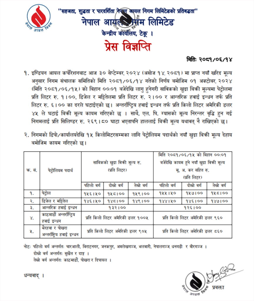 सोमबार राति १२ बजेबाट लागु हुने गरी निगमले पेट्रोलमा १, डिजेल र मट्टीतेलमा २/२, हवाई इन्धनमा आन्तरिकमा ६ तथा बाह्यमा प्रतिहजार लिटरमा ४५, मट्टीतेलमा दुई रुपैयाँ मूल्य घटाइएको निगमले जनाएको छ ।