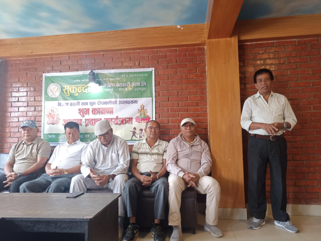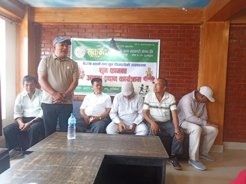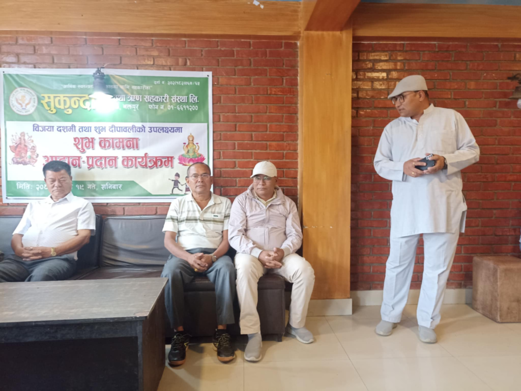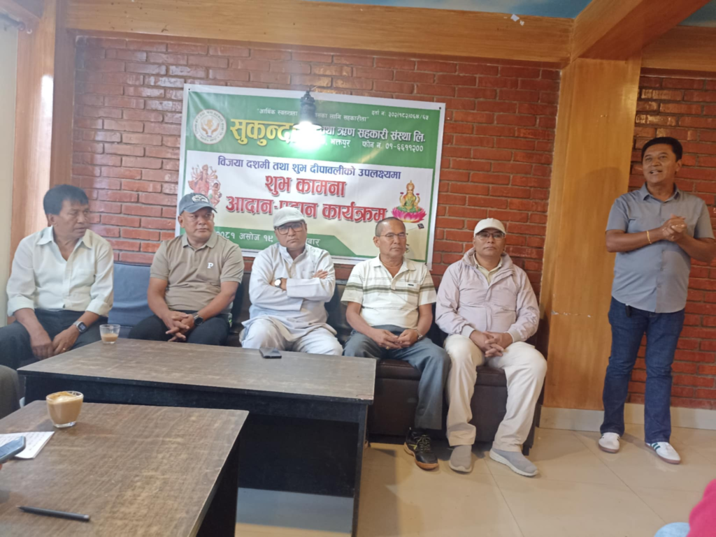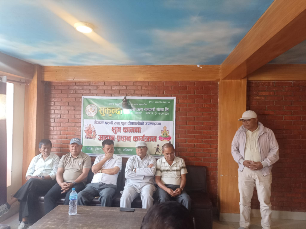 भक्तपुर, असोज १९ । आर्थिक स्वतन्त्रता र विकासका लागि सहकारीता भन्ने मुल नाराका साथ जगाती स्थित सुकुन्दा बचत तथा ऋण सहकारी संस्था लिमिटेडको आयोजनामा शनिबार विजया दशमी तथा शुभ दीपावलीको उपलक्ष्यमा शुभकामना आदान-प्रदान कार्यक्रम सम्पन्न भयो ।