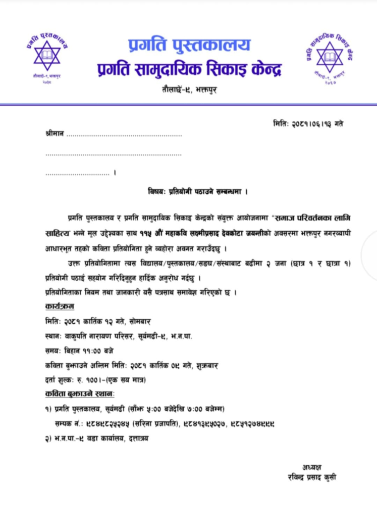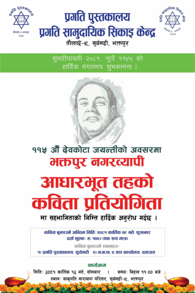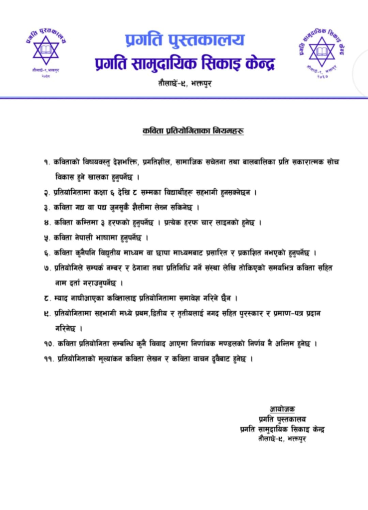 कार्तिक ४, भक्तपुर । प्रगति पुस्तकालय र प्रगति सामुदायिक सिकाइ केन्द्रको संयुक्त आयोजनामा कविता प्रतियोगिता हुने भएको छ । समाज परिवर्तनका लागि साहित्य भन्ने मूल उद्देश्यका साथ ११५ औं महाकवि लक्ष्मीप्रसाद देवकोटा जयन्तीको अवसरमा भक्तपुर नगरव्यापी आधारभूत तहको कविता प्रतियोगिता हुन लागेकाे आयोजक समितिले जनाएको छ ।