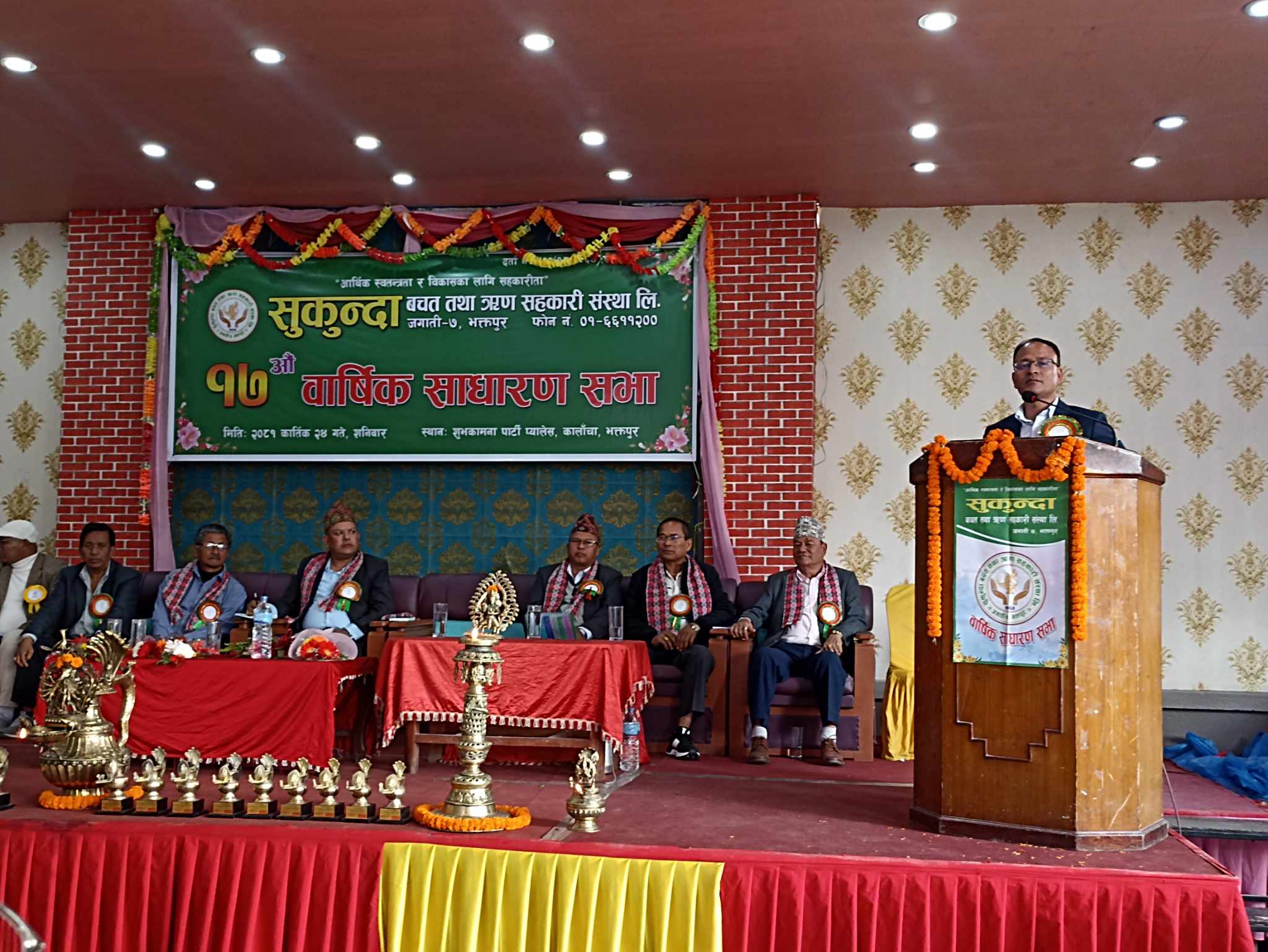 भक्तपुर, कार्तिक २४ । भक्तपुर नगरपालिका वडा नं ७ जगाती स्थित सुकुन्दा बचत तथा ॠण सहकारी संस्थाको १७ औं वार्षिक साधारण सभा बागमती प्रदेश सभाका सभासद सुरेन्द्रराज गोसाइको प्रमुख आतिथ्यतामा शनिबार एक कार्यक्रमविच सम्पन्न भयो ।