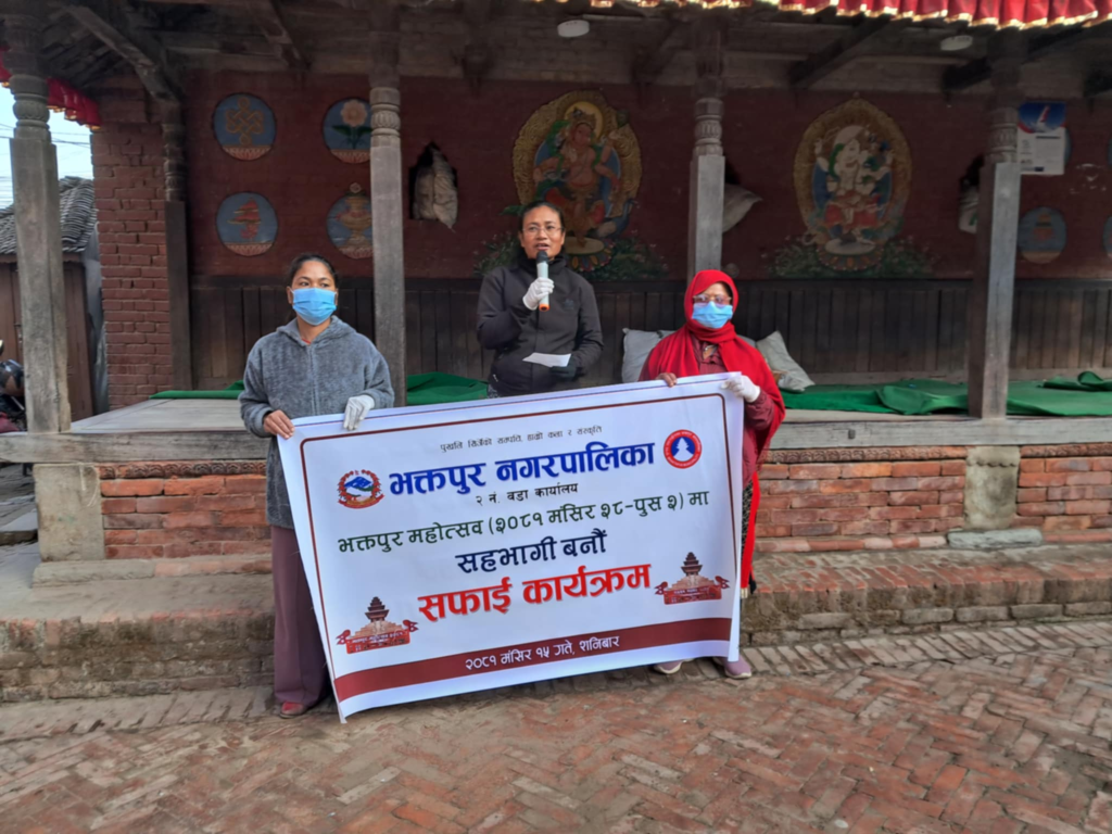 भक्तपुर, मंसिर १५ । भक्तपुर नगरपालिकाको पाक्षिक सरसफाई कार्यक्रम अन्तर्गत भक्तपुर महोत्सब लक्षित गरी वडा नं. २ मा सरसफाई कार्यक्रम सम्पन्न भयो ।