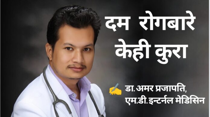 पछिल्लो केही दशकमा दमका बिरामीहरूको सङ्ख्या बढ्दै गएको छ । हाम्रो शरीरको फोक्सोको श्वास नली खुम्चिनु र धेरै खकार निस्कने अवस्थालाई दम भनिन्छ । यसले श्वास फेर्न गाह्रो हुने, स्वाँ–स्वाँ हुने (Wheezing) तथा खोकी लाग्ने गर्दछ । दमले कसैलाई सामान्य, कसैलाई दैनिक क्रियाकलापमा असर पार्छ र थोरैलाई ज्यानको खतरा पनि हुन सक्छ ।
