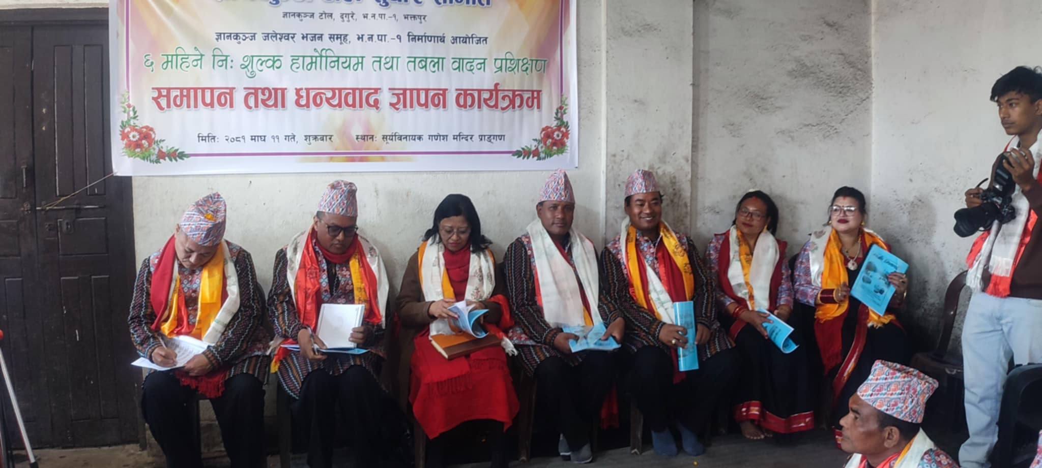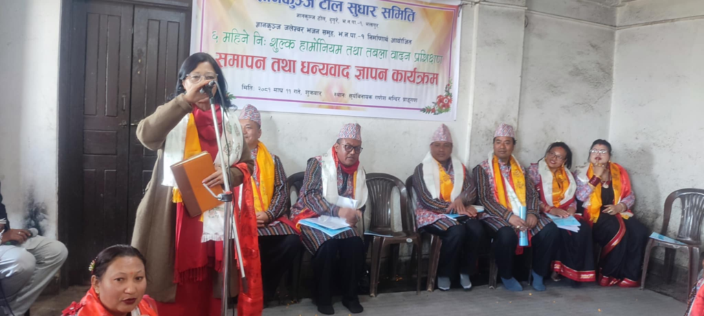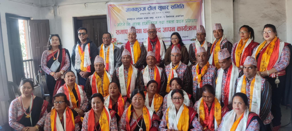 भक्तपुर, माघ ११ । ज्ञानकुञ्ज टोल सुधार समिति द्वारा ६ महिना अघि देखि शुरु गरेको नि:शुल्क तबला एवं हार्मोनियम प्रशिक्षण कार्यक्रम एक समारोहबीच समापन तथा धन्यबाद जापन कार्यक्रम सम्पन्न भयो ।