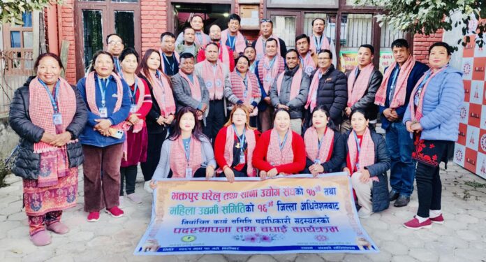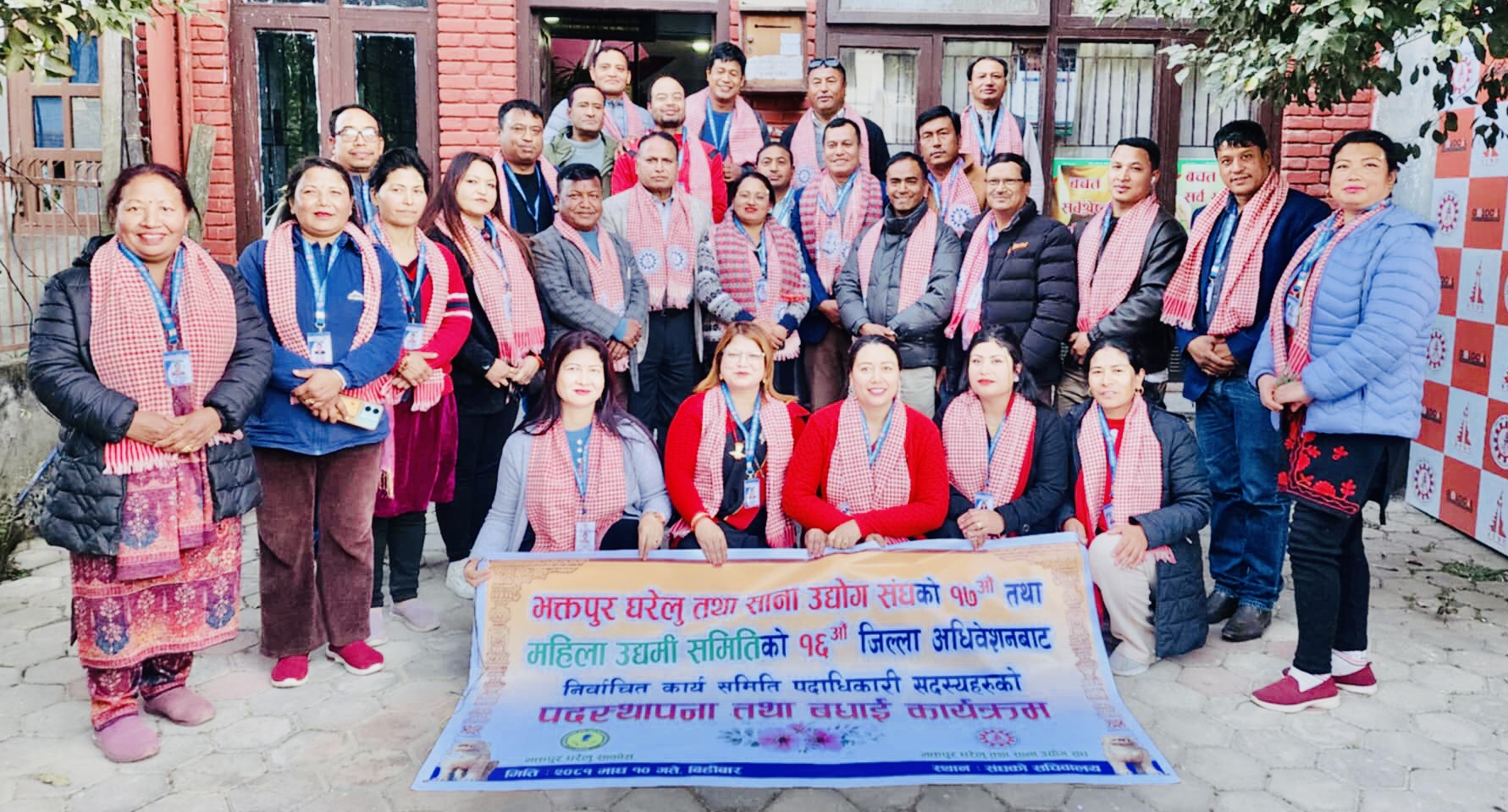 २०८१ पुष २६ गते सम्पन्न भक्तपुर घरेलु तथा साना उद्योग संघको १७ औ तथा महिला उद्यमी समितिको १६ औ जिल्ला अधिवेशनबाट निर्वाचित पदाधिकारी सदस्यहरुलाई पदस्थापना तथा बधाई कार्यक्रम नेपाल घरेलु तथा साना उद्योग महासंघका अध्यक्ष श्री उमेशप्रसाद सिहज्युको प्रमुख आतिथ्यतामा सम्पन भयो ।