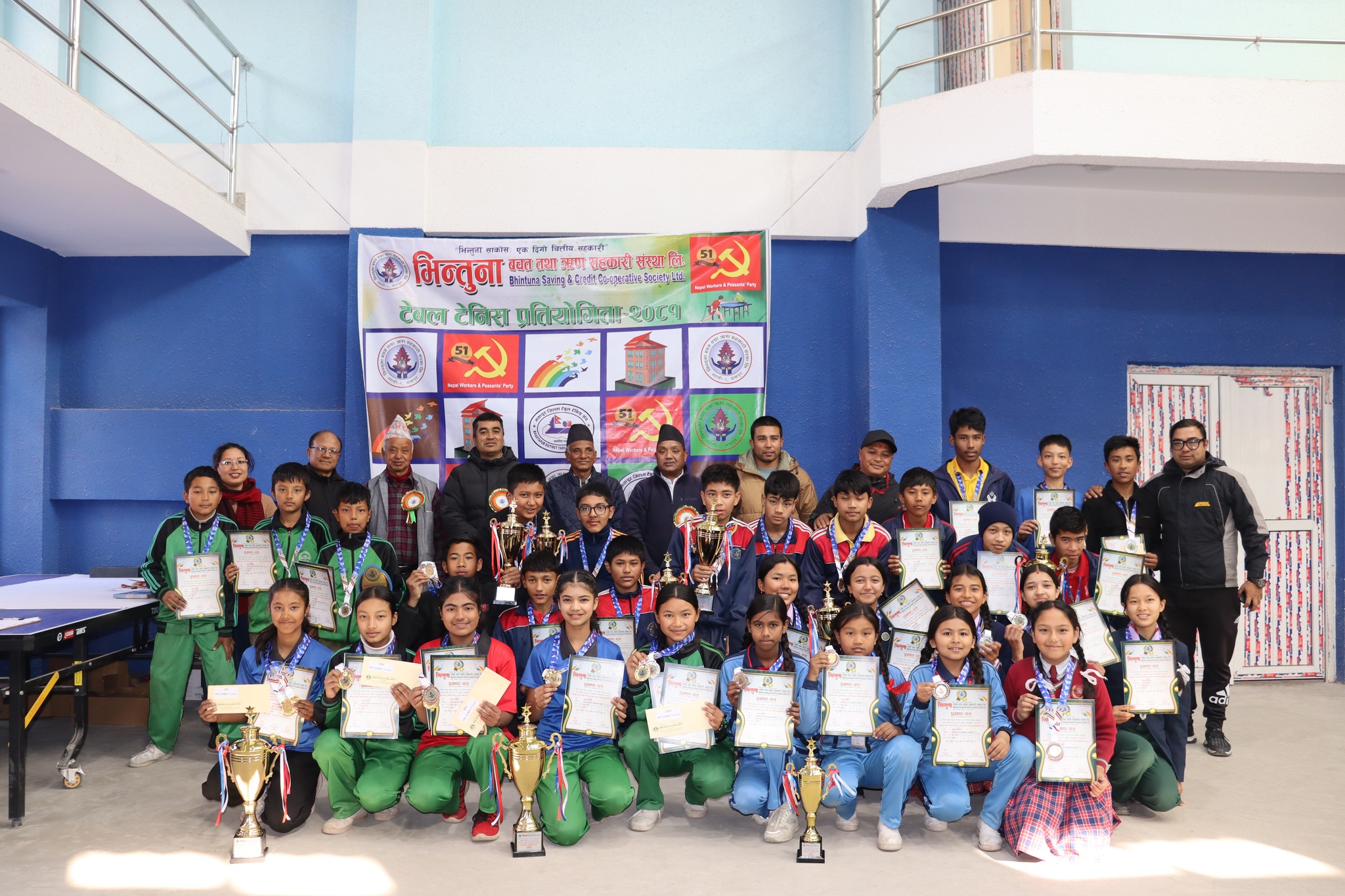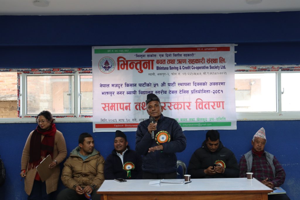 भक्तपुर, १९ माघ । नेपाल मजदुर किसान पार्टीको ५१ औँ पार्टी स्थापना दिवसको अवसरमा भिन्तुना बचत तथा ऋण सहकारी लि.काे आयाेजनामा भक्तपुर नगरव्यापी टेबुलटेनिस प्रतियोगिताको आयोजना माघ १६ गतेदेखि १८ गतेसम्म बेखाल टेबुलटेनिस कभर्डहलमा शुक्रबार सम्पन्न भयाे ।