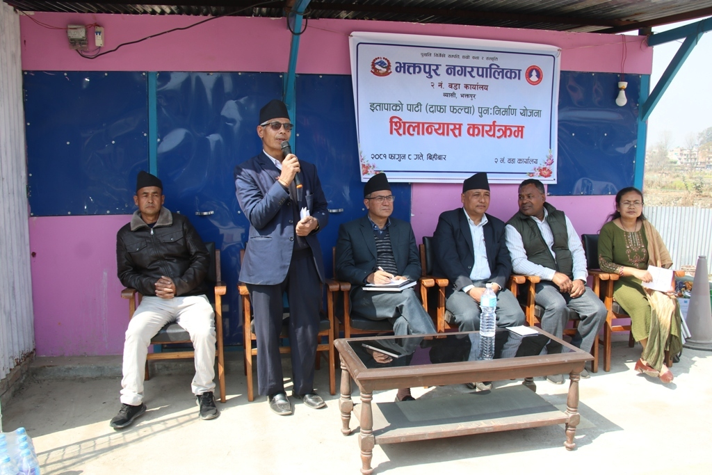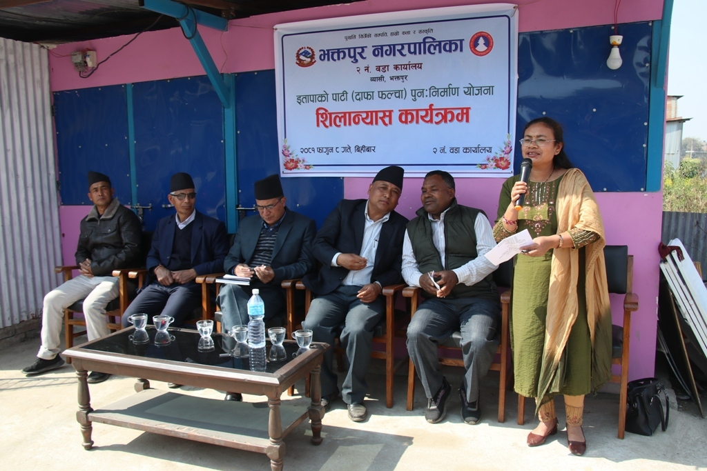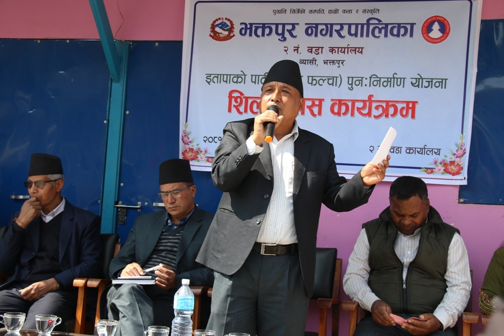 भक्तपुर नगरपालिकाका प्रमुख सुनिल प्रजापतिले भक्तपुर नपा वडा नं. २ देका मिवा इतापाके आवास योजनामा अवस्थित इतापाके फल्चा (पाटी) को बिहीबार एक कार्यक्रमबीच शिलान्यास गर्नुभयो ।