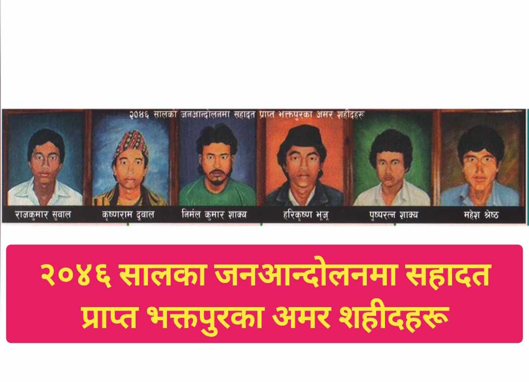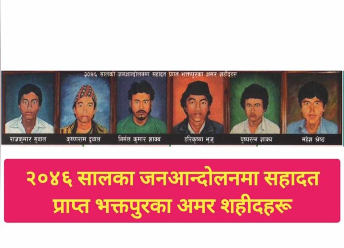 (तत्कालीन पञ्चायती निरङ्कुश शासन व्यवस्थाविरुद्ध २०४६ साल फागुन ८ गतेमा जनआन्दोलनको शङ्खघोष भएको दिन हो । गोलीकै भरमा जनतालाई दबाउन सकिने मानसिकता बोकेका पञ्चहरूले जनताको आन्दोलन दबाउने दुष्प्रयास गरे । पञ्चायती व्यवस्था ढाल्न भएको आन्दोलनकै क्रममा भक्तपुरका चार जना युवाहरूले पनि सहादत्त प्राप्त गरे । त्यो बलिदानकै कारण आन्दोलनको रापमा तीस वर्ष जरा गाडेर बसेको पञ्चायत ढल्यो । जनआन्दोलन सफल भयो । आफ्नो जीवन होमेका योद्धाहरूको सम्मानमा हरेक फागुन ८ लाई जनताले सहिद दिवसको रूपमा मनाउँदै आएका छन् ।