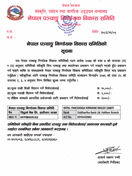पञ्चाङ्ग निर्णायक विकास समितिको गठन आदेश २०७७ को दफा ७ को उपदफा (ञ) र (ठ) अनुसार समितिको स्वीकृति बिना पञ्चाङ्ग तथा क्यालेण्डर प्रकाशन गर्न नपाइने भएको हुँदा प्रकाशन गर्न चाहने व्यक्ति वा संस्थाहरूले नेपाल पञ्चाङ्ग निर्णायक विकास समितिबाट स्वीकृति लिएर मात्र प्रकाशन गर्न अनुराेध गरेकाे हाे ।