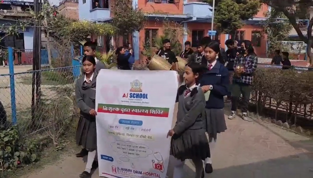 भक्तपुर, फागुन १५ । सुर्यविनायक स्थित एजे स्कूलको आयोजनामा यहीँ फागुन १७ गते हुने निःशुल्क वृहत स्वास्थ्य शिविर प्रचारार्थ बिहिबार विद्यालयले स्वास्थ्य शिविर प्रचारार्थ र्याली सम्पन्न गरेको छ ।