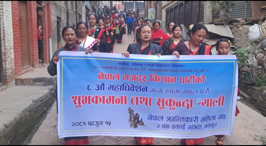 भक्तपुर, फागुन १५ । नेपाल क्रान्तिकारी महिला संघ २ वडा ब्यासी इकाई समितिको आयोजनामा फागुन १६,१७,१८ र १९ गते भक्तपुरमा हुने नेमकिपाको आठौं महाधिवेशन प्रचारार्थ सुकुन्दा र्याली सम्पन्न भयो ।