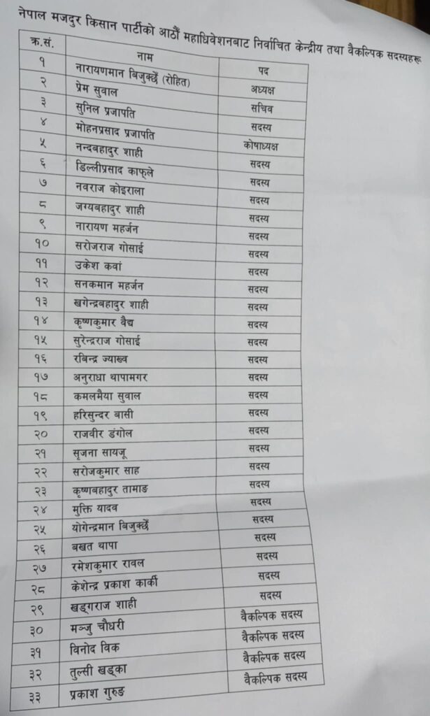भक्तपुर, फागुन २० । नेपाल मजदुर किसान पार्टीको आठौँ महाधिवेशनले अध्यक्षमा पुनः नारायणमान बिजुक्छें सर्वसम्मत निर्वाचित भएका छन् ।