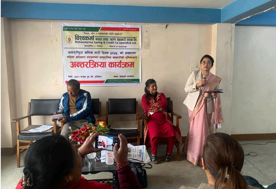 विश्वकर्मा वचत तथा ऋण सहकारी संस्थाले ११५ औं अन्तर्राष्ट्रिय श्रमिक नारी दिवसको अवसरमा आयोजित ‘महिला अधिकार संरक्षणमा समुदायमा आधारित सहकारी संस्थाको भूमिका’ विषयक अन्तरक्रिया तथा महिला सदस्य भेलामा उहाँले महिलालाई वर्गीय चेतना र शोषणविरुद्ध आवाज उठाउन सक्षम जनशक्ति विकास गर्न यस किसिमको भेलाले मद्दत पुऱ्याउने बताउनुभयो ।