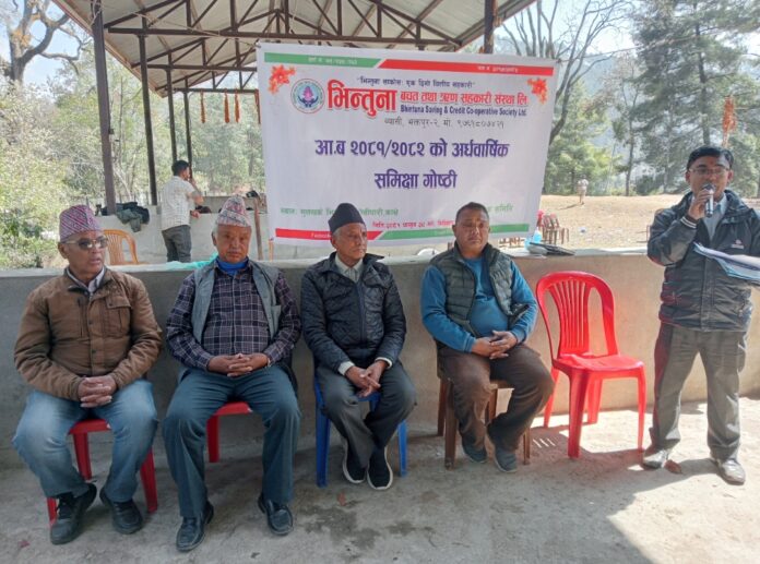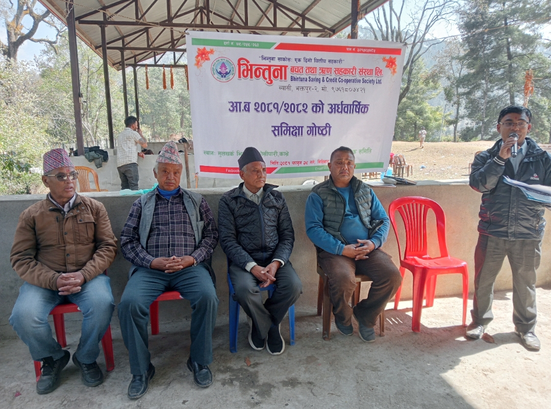 भिन्तुना बचत तथा ऋण सहकारी संस्थाको आयोजनामा काभ्रे कोशी पारिको मुलखर्क भिमेशेन स्थानमा आ.ब.२०८१/०८२ अर्धवार्षिक समिक्षा गोष्ठी सम्पन्न भयो | कार्यक्रममा प्रमुख अतिथि नेमकिपा भक्तपुर नगर समितिका पुर्व अध्यक्ष एवं भक्तपुर नगरपालिका १५ नम्बर वडाका पुर्व वडा अध्यक्ष रबिन्द्र खर्बुजाले भिन्तुना साकोसको थप प्रगतिको शुभकामना ब्यक्त गर्दै मुलखर्क मा भिमशेन मन्दिरको स्थापना बारे चर्चा गर्नुभयो |