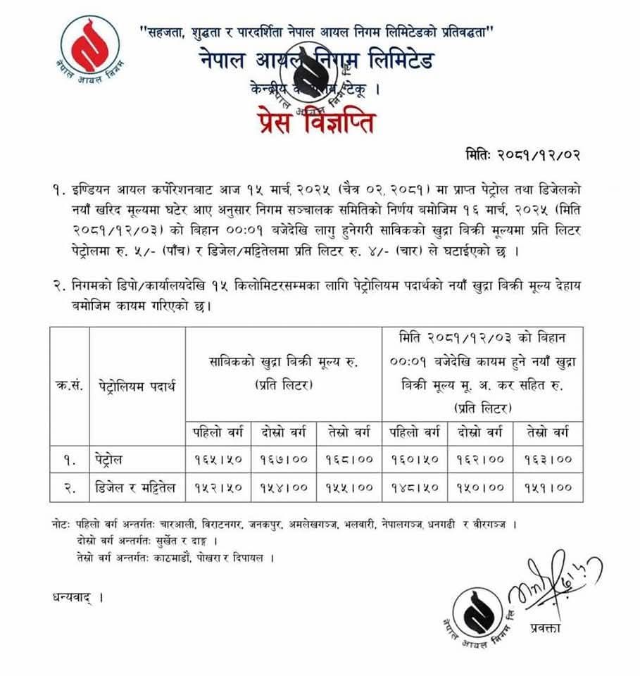 अब नयाँ मुल्य अनुसार काठमाडौँमना पेट्रोलको मुल्य १६३, डिजेल तथा मट्टीतेलको मुल्य १५१ प्रति लिटर कायम भएको निगमले जनाएको छ ।