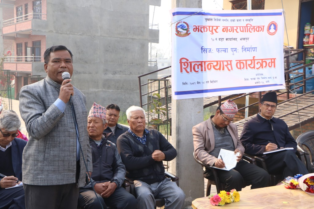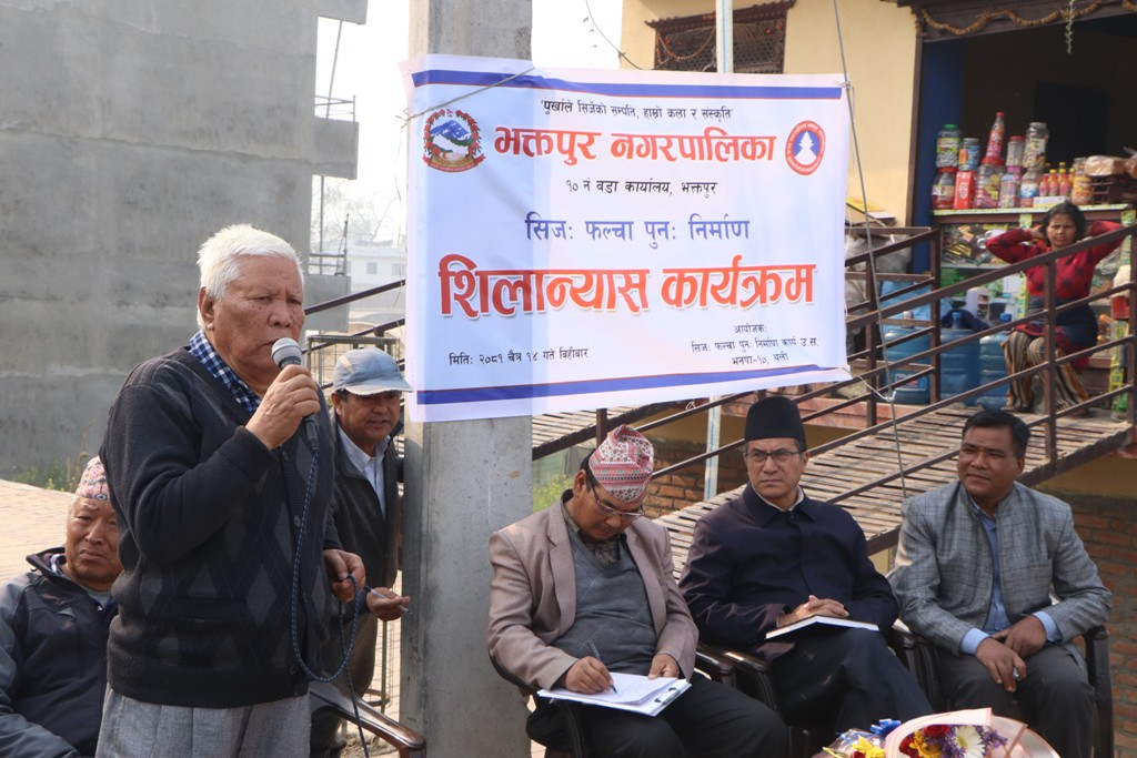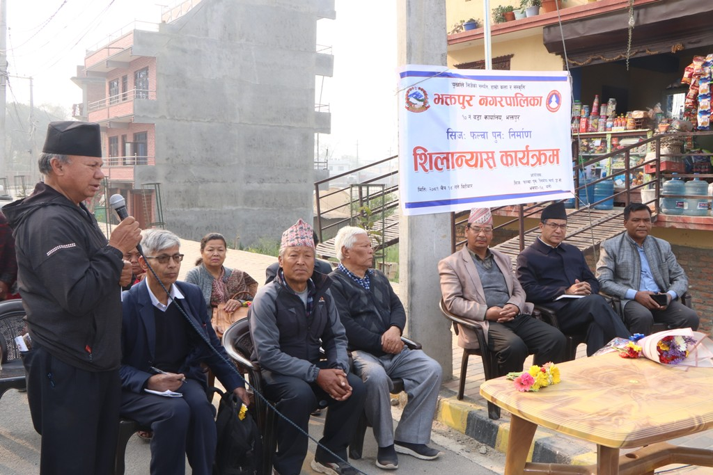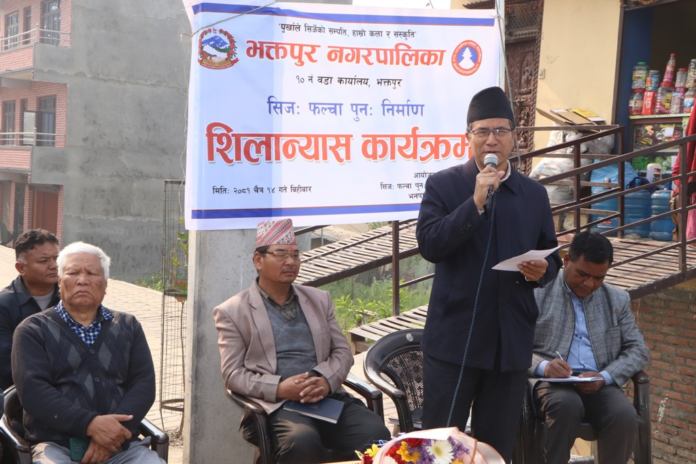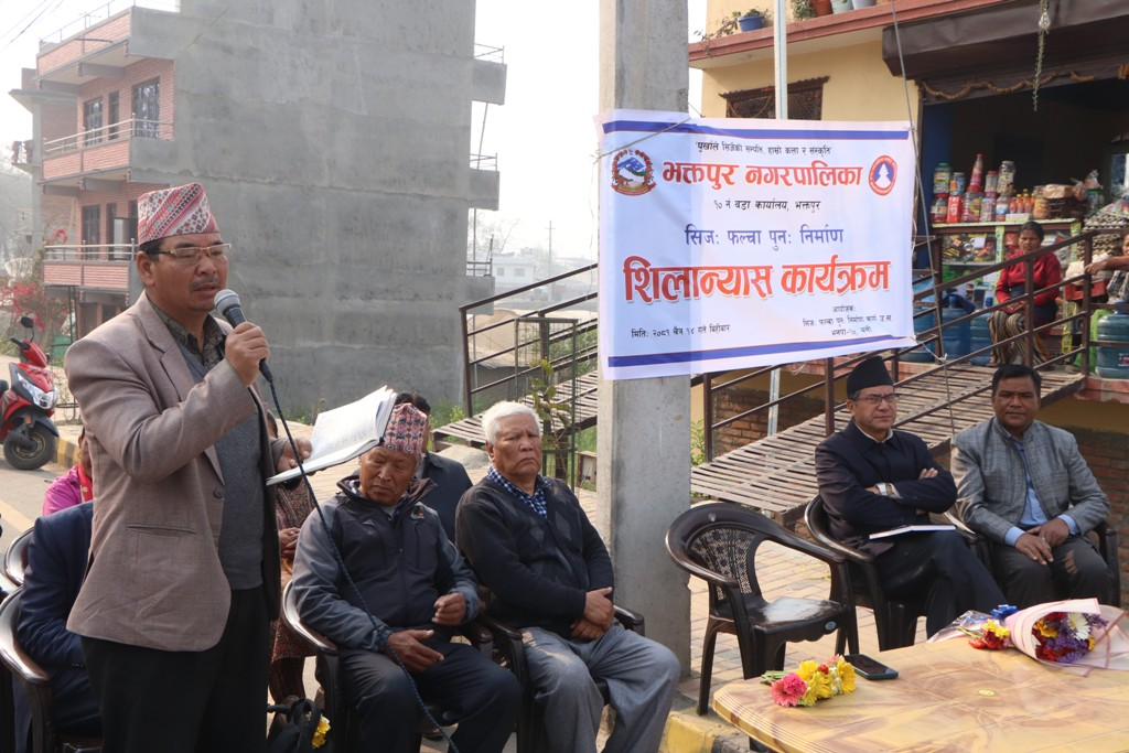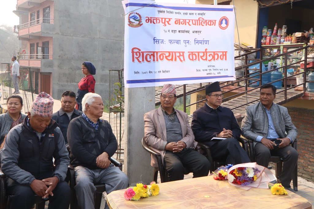 फल्चा शिलान्यास गर्दै नगर प्रमुख प्रजापतिले भक्तपुरका ठाउँहरुको प्राचिन नामहरुको संरक्षण गर्नु हाम्रो दायित्व भएको बताउँदै भक्तपुरको पहिचान जोगाउन यहाँको धार्मिक, सांस्कृतिक र ऐतिहासिक महत्व भएका टोल, बस्ती, मठ, मन्दिर, सत्तल , पाटी आदिको प्राचिन नामको संरक्षण हुनु जरुरी रहेको बताउनुभयो ।