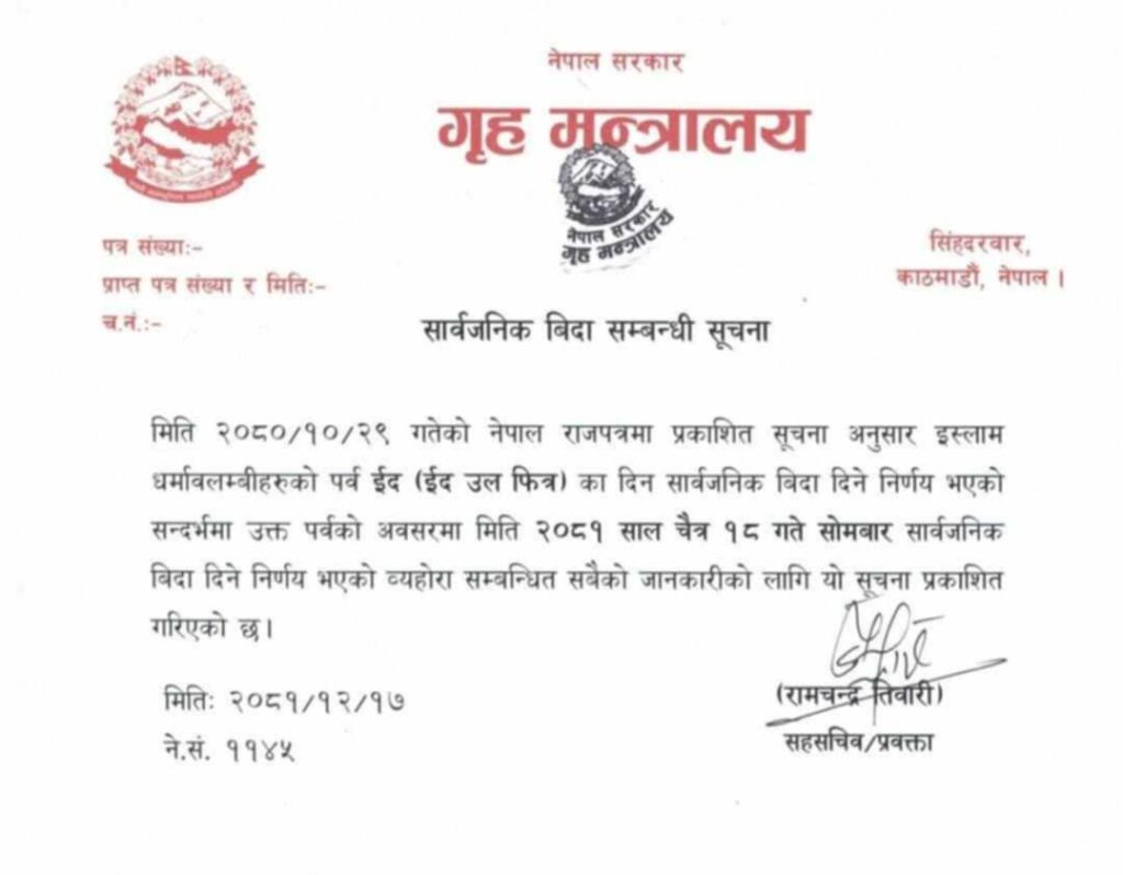 काठमाडौं, चैत १७ । सरकारले इस्लाम धर्मावलम्बीको ठूलो पर्व इद उल फित्रका दिन चैत १८ गते सोमबार देशभर सार्वजनिक बिदा दिएको छ । गृह मन्त्रालयले सूचना जारी गर्दै उक्त दिन सार्वजनिक बिदा दिएको हो ।