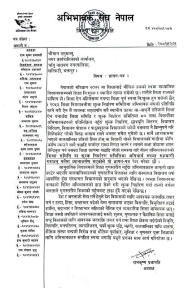 भक्तपुर, चैत २१ । अभिभावक संघ नेपाल भक्तपुर जिल्ला कार्य समितिले ज्ञापनपत्र चाँगुनारायण नगरपालिकाका प्रमुख जीवन खत्रीलाई वहाँको कार्यकक्षा खरिपाटीमा बिहिबार हस्तातरण गर्नुभयो ।ज्ञापनपत्र बुझ्दै प्रमुख जीवन खत्रीले समुदाय विद्यालय गुणस्तर बृद्धि गर्न र सकारात्मक र राम्रो बनाउनेतर्फ ध्यान केन्द्रीत भएको बताउँदै संस्थागत विद्यालय प्रविधिमैत्री भएको अभिभावक र विद्याथीहरु सामुदायक विद्यालयको विश्वास घटिरहेको बताउनुभयो । उहाँले २०५५ को शिक्षा नियमावलीमा अभिभावक संघको प्रतिनिधित्व रहेको जानकारी भएको भए स्थानीय तहको शिक्षा ऐनमा राख्न पहल हुने थियो तर देश भरिको स्थानीय तहमा नभएकोले पनि यसतर्फ ध्यान केन्द्रीत नभएको बताउनुभयो । उहाँले अभिभावकहरुको समस्या सम्बोधन गर्न कार्यविधि बनाएर भएपनि प्रतिनिधित्व गराउन पहल गराउने आश्वासन दिँदै कानुनी र विधिबाट बाधा नभए सहजीकरण र समन्वय अगाडि बढाउने बताउनुभयो ।कार्यक्रममा अभिभावक संघ नेपाल भक्तपुर जिल्ला समितिका अध्यक्ष रामकृष्ण प्रजापतिले घाउ लागेको व्यक्तिलाई मात्र चोट थाहा पाउने बताउँदै अभिभावकहरुको समस्या अरुले सम्बोधन गर्न नसक्ने भएकोले शुल्क निर्धारण समितिमा अभिभावकको प्रतिनिधि अनिवार्य देखिएको बताउनुभयो । उहाँले नयाँ शैक्षिक सत्र सुरु हुन केहि दिनमात्र बाकी भएकोले नयाँ भर्ना अभियान, शुल्क निर्धारण, पाठ्यपुस्तक, विद्यालय पोशाक लगायतको विषयमा स्थानीय सरकारले टुङ्गो लगाउन अभिभावकको प्रतिनिधि राखेर मात्र निर्णय गर्नुपर्ने बताउँदै शुल्क निर्धारण लगायत विषयमा प्रत्यक्ष सरोकार राख्ने ८० लाख विद्यार्थीका अभिभावकहरुको सहभागितामा अनिवार्य हुनुपर्ने बताउनुभयो । उहाँले अभिभावकहरुलाई स्थानीय तहको शिक्षा समिति वा शुल्क निर्धारण समिति बाहिर राखेर शिक्षालाई अगाडि बढाउन खोज्नु हातखुट्टा बाँधेर दौडाउनु वा लंगडो घोडालाई दौडाएर प्रतिस्पर्धामा सफल हुने दिवास्वप्न जस्तै हुने बताउनुभयो ।