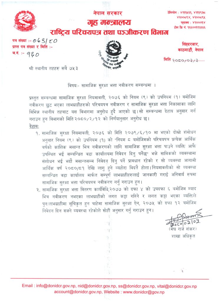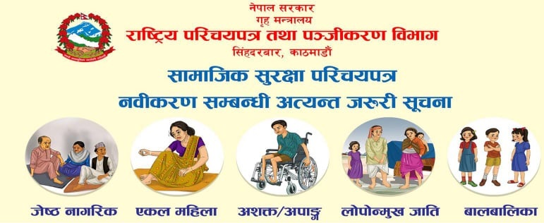 - काठमाडौं, असार १५, सामाजिक सुरक्षा भत्ता प्राप्त गरिरहेका लाभग्राहीहरुले यहि श्रावण १ गते देखि भदौ मसान्तसम्ममा आ-आफ्नो वडा कार्यालयमा गई सामाजिक सुरक्षा परिचयपत्र नवीकरण गर्न राष्ट्रिय परिचयपत्र तथा पञ्जिकरण विभागले ७५३ वटै स्थानिय तहहरुलाई पत्राचार गरेको छ । तोकिएको समय भित्र सामाजिक सुरक्षा परिचयपत्र नवीकरण नभएमा उक्त लाभग्राहीको नाम प्रणाली बाट हट्ने र पुनः नयाँ लाभग्राहीका रुपमा नाम दर्ता गर्नु पर्ने र सो विचको अवधिको सामाजिक सुरक्षा भत्ता प्राप्त नहुने व्यवस्था रहेको छ ।