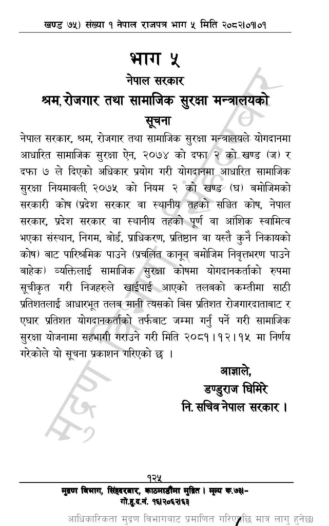 काठमाडौं, वैशाख २ । श्रम रोजगार तथा सामाजिक सुरक्षा मन्त्रालयका निमित्त सचिव डण्डुराज घिमिरेका अनुसार नयाँ वर्ष, २०८२ को पहिलो दिन राजपत्रमा सोसम्बन्धी सूचना प्रकाशन गरिएको छ।