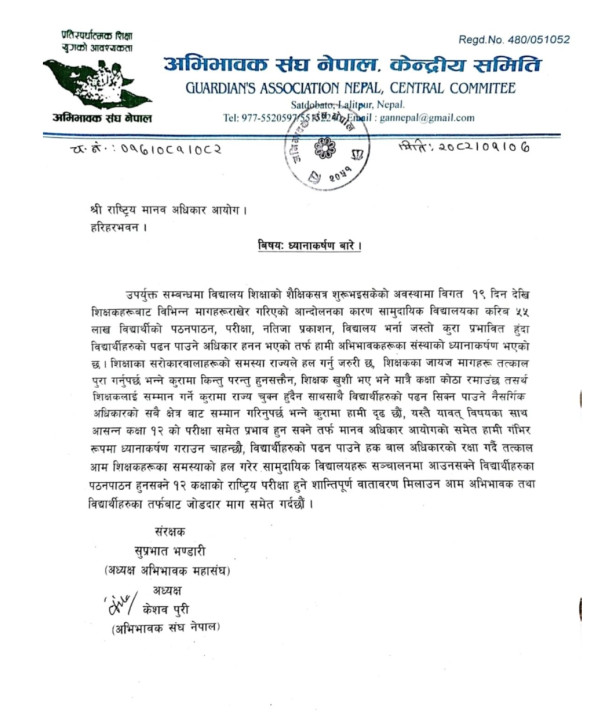 काठमाडौ, बैशाख ७ गते । अभिभावक संघ नेपाल, केन्द्रीय समितिले जारी शिक्षक आन्दोलनका कारण सामुदायिक विद्यालयका करिब ५५ लाख विद्यार्थीको पढ्न पाउने अधिकार हनन् भएको भन्दै राष्ट्रिय मानव अधिकार आयोगको ध्यानाकर्षण गराएको छ । शिक्षक आन्दोलनका कारण विद्यार्थीहरूको पढ्न पाउने अधिकार हनन भएको भन्दै अभिभावक महसंघका अध्यक्ष सुप्रभात भण्डारी, संघका अध्यक्ष केशव पुरी सहितको टोलीले आईतबार आयोगमा उक्त ध्यानाकर्षण पत्र बुझाएका हुन्।