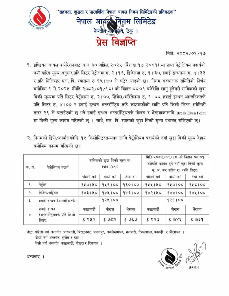निगमका अनुसार पेट्रोलको मूल्य प्रतिलिटर २ रुपैयाँ घटेको छ भने डिजेल र मट्टितेलको मूल्य १ रुपैयाँ घटेको छ । यस्तै हवाई इन्धन आन्तरिकतर्फ प्रतिलिटर ४ रुपैयाँ र अन्तर्राष्ट्रियतर्फ २९ डलर प्रतिकिलो लिटर घटाइएको छ ।
