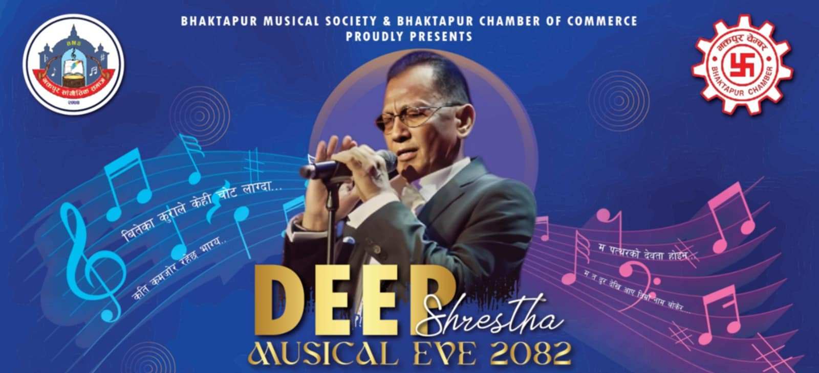 भक्तपुर सांगीतिक समाज र भक्तपुर चेम्बर अफ कमर्सको संयुक्त रुपमा भक्तपुर जिल्लामा नै पहिलो पटक दीप श्रेष्ठको एकल प्रस्तुती आयोजना गरिएको बताइएको छ । कार्यक्रमको सम्पूर्ण तयारी भइसकेको आयोजक समितिले जनाएको छ । कार्यक्रम स्थलमा विभिन्न उत्पादनहरु एवं विभिन्न भक्तपुरका स्थानीय परिकारका खानाका स्टलहरू समेत रहने बताइएको छ ।