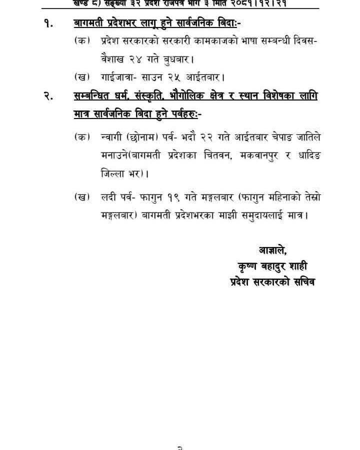 २०८२ बैशाख २४ गतेका दिन बागमती प्रदेशका सरकारी कार्यालयहरूमा सार्वजनिक बिदा दिने निर्णय गरेको राजपत्रमा प्रकाशित छ ।