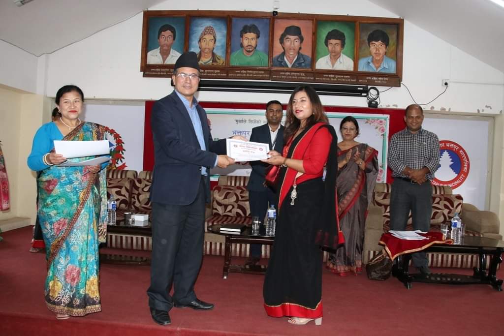 भक्तपुर नगरपालिकाको आयोजनामा भएको ६ महिने बुटिक, ६ महिने हेयर कटिङ, ४ महिने पाक शिक्षा र ६ महिने आधारभूत सिलाई तालिमका प्रशिक्षार्थीहरूलाई प्रमाणपत्र वितरण कार्यक्रम शुक्रबार सम्पन्न भयो ।