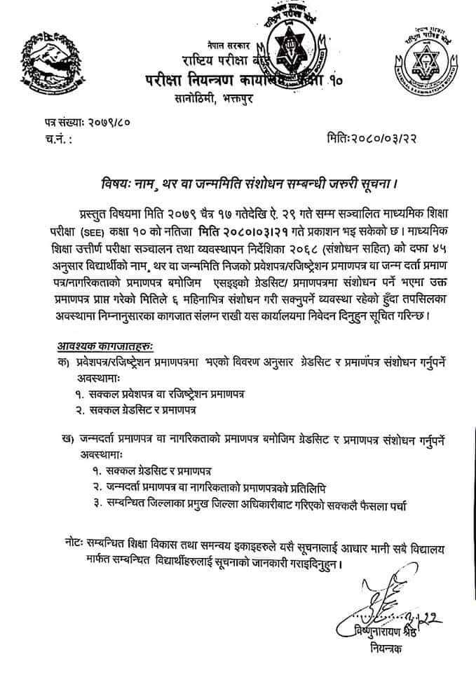 माध्यमिक शिक्षा परीक्षा (एसईई) को प्रमाण पत्रमा विद्यार्थीको नाम, थर र जन्ममिति सच्याउन परेमा अबको ६ महिनाभित्र सच्याउन सकिने राष्ट्रिय परीक्षा बोर्डले जनाएको छ । ‘उमेर, नाम, जात सच्याउने नियमहरू, २०१७’ अनुसार विद्यार्थीले प्रमाण पत्र पाएको ६ महिनाभित्र प्रमुख जिल्ला अधिकारी ९सीडीओ० समक्ष निवेदन दिनुपर्नेछ । प्राप्त निवेदन अनुसार प्रमुख जिल्ला अधिकारीले फैसला पर्चा र सिफारिस गरेको आधारमा मात्रै बोर्डले नाम, थर र जन्ममिति सच्याउन मिल्छ ।