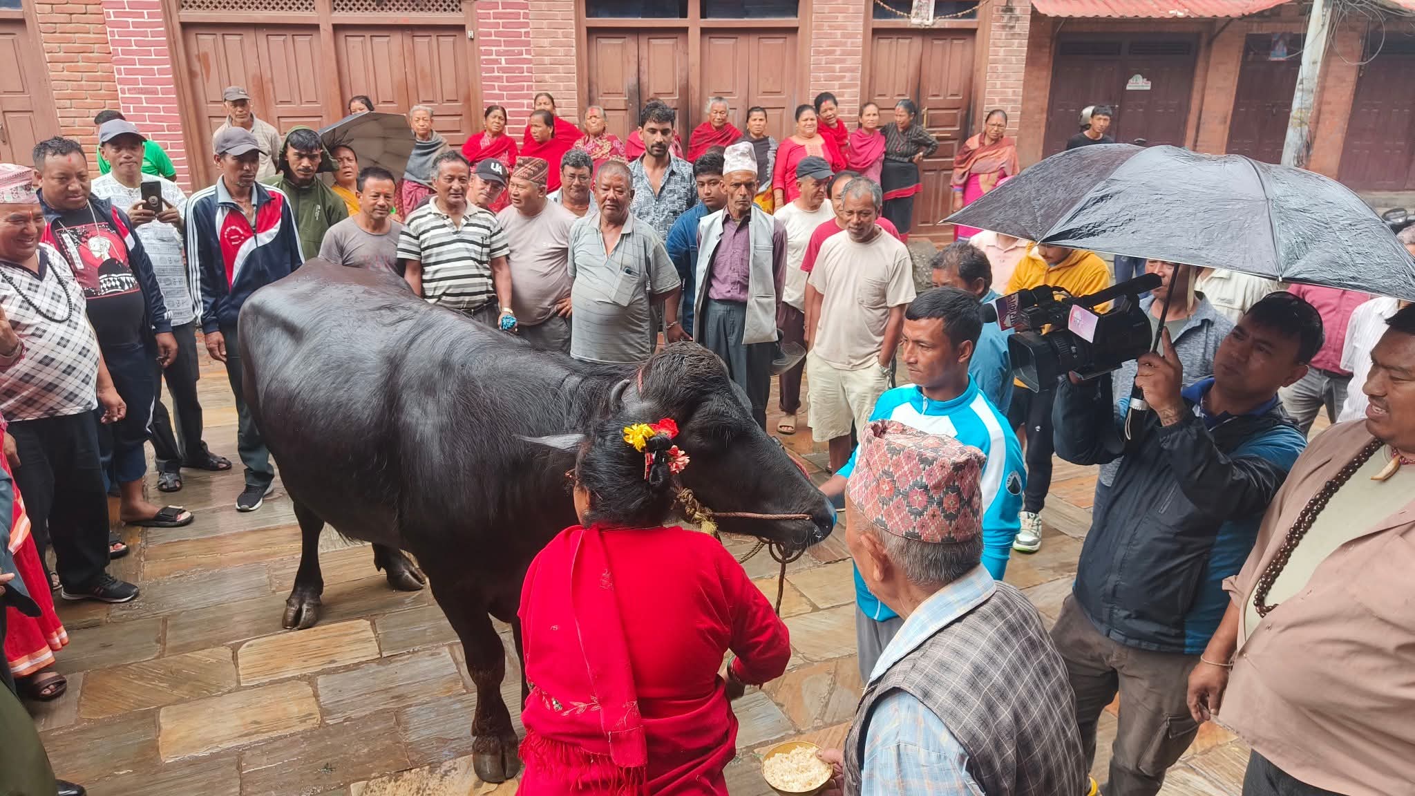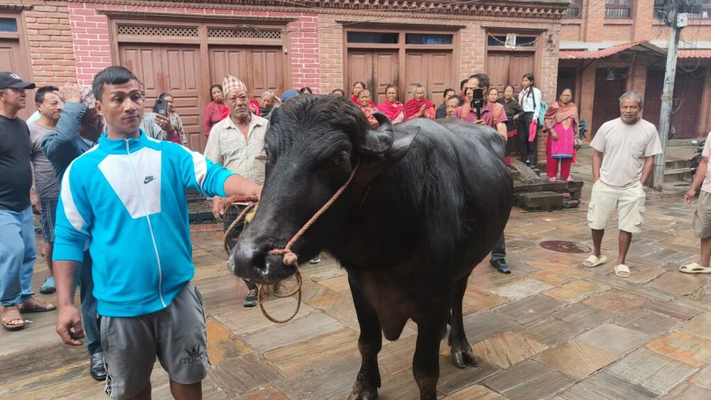 भक्तपुर । नेपालकै लामो जात्राको रूपमा मानिने नवदुर्गा देवगण जात्राको परम्पराअनुसार सोमबार नवदुर्गा द्योछेमा खम्ये (राँगो) भित्र्याइएको छ । उक्त खम्ये गठेमङगल पछि मन्दिरको मूल पुजारी नकींले विशेष पूजा गरेर खम्ये नवदुर्गा द्योछँमा भित्र्याउने चलन रहदै आएको छ