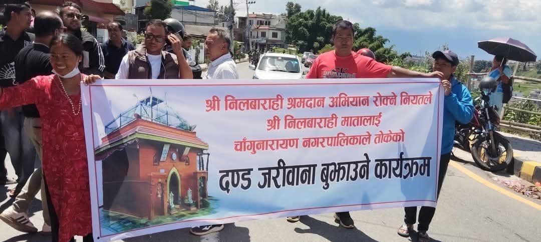 भक्तपुर, भदौ ६ । भक्तपुरको नीलबाराही क्षेत्रका श्रमदाताहरूले बाजागाजासहितको सांस्कृतिक टोलि लिएर चाँगुनारायण नगरपालिकामा रु. ५० हजार जरिवाना बुझाएका छन्।