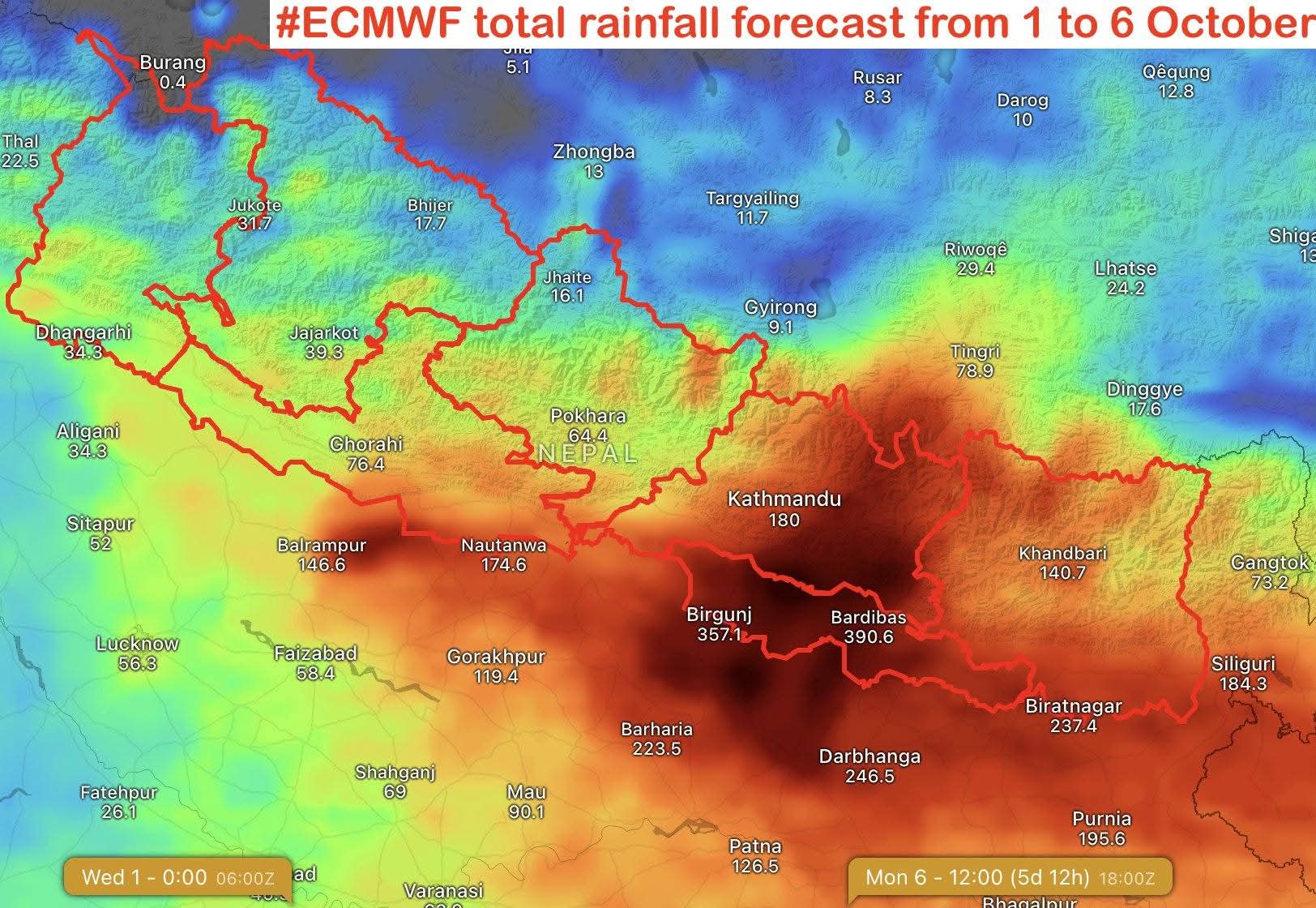 जल तथा मौसम विज्ञान विभागका अनुसार विशेषगरी कोशी, मधेश, बागमती, गण्डकी र लुम्बिनी प्रदेशमा वर्षा बढी हुने अनुमान गरिएको छ। नारायणी, बागमती, कमला र कोशी नदीमा बहाव खतरा तहसम्म पुग्न सक्ने देखिएको छ भने विशेषगरी काठमाडौं उपत्यका, काभ्रे, सिन्धुपाल्चोक, रसुवा, मकवानपुर, चितवन, संखुवासभा, ताप्लेजुङ्ग, इलाम, झापा, मोरङ, बारा, पर्सा, सर्लाही र रौतहटलगायतका जिल्लामा स–साना नदीमा आकस्मिक बहावको जोखिम उच्च रहेको चेतावनी दिइएको छ।