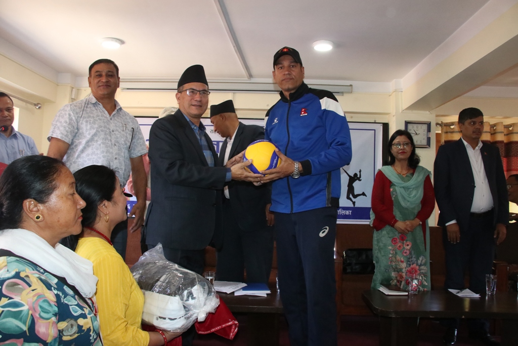 भक्तपुर नगरपालिकाका प्रमुख सुनिल प्रजापतिले आज भलिबल प्रशिक्षक तालिमका मुख्य प्रशिक्षकद्वय जगदीशप्रसाद भट्ट र विजयकृष्ण बाडेमार्फत खेलकुद सामाग्रीहरु हस्तान्तरण गर्नुभयो ।
