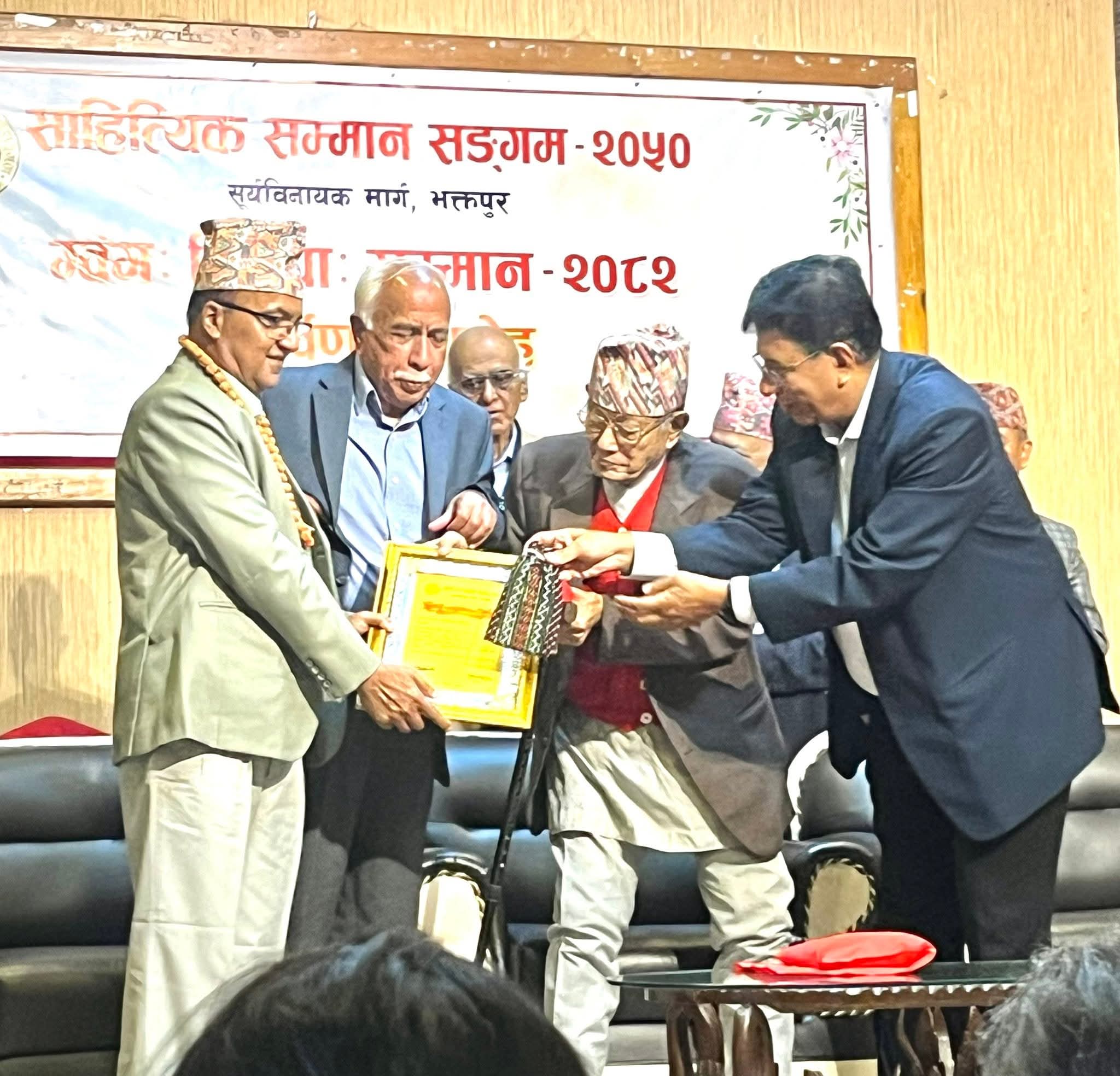 भक्तपुर, कार्तिक ८ । साहित्यिक सम्मान सङ्गम २०५० को आयोजनामा शनिबार दुई साहित्यकारलाई नगद राशि रु ५० हजार पाँच रूपैयाँ बराबरको ग्वंग सिरपा सम्मान २०८२ द्वारा सम्मानित गरिएको छ ।