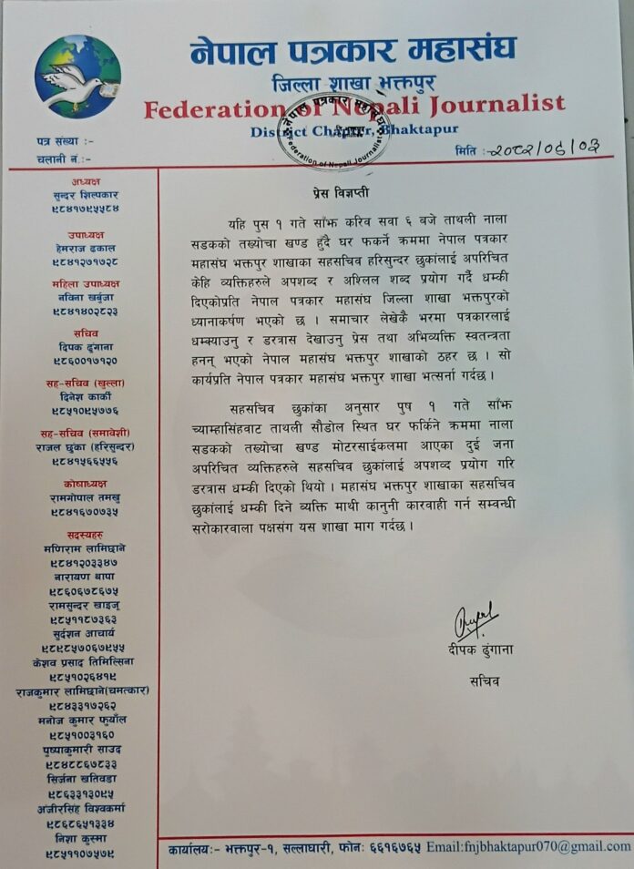 भक्तपुर,पुष ४ । नेपाल पत्रकार महासंघ, जिल्ला शाखा भक्तपुरले आफ्ना पदाधिकारीमाथि भएको धम्कीपूर्ण घटनाप्रति गम्भीर ध्यानाकर्षण भएको जनाएको छ। महासंघद्वारा जारी प्रेस विज्ञप्ति अनुसार गत पुष १ गते साँझ करिब सवा ६ बजेतिर ताथली–नाला सडकखण्ड हुँदै घर फर्कने क्रममा महासंघ भक्तपुर शाखाका सहसचिव हरिसुन्दर छुकां माथि केही अज्ञात व्यक्तिहरूले अपशब्द प्रयोग गर्दै धम्की दिएका थिए। मोटरसाइकलमा आएका दुई जना अज्ञात व्यक्तिहरूले पत्रकार छुकांमाथि डरत्रास देखाउने तथा अपमानजनक शब्द प्रयोग गरेको जनाइएको छ।