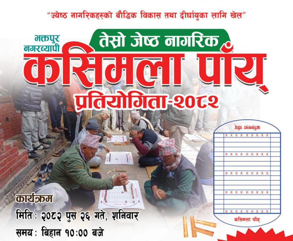 भक्तपुर, पुष १९ ।ज्येष्ठ नागरिकको बाैद्धिक विकास तथा दीर्घायुका लागि खेल भन्ने मूल उद्देश्यका साथ भक्तपुरमा तेस्रो ज्येष्ठ नागरिक कसिमला पाँय् प्रतियोगिता हुने भएको छ ।भक्तपुर नगरपालिका वडा नं ९ स्थित वाकुपति चाँगुनारायण परिसर सहयोग समितिको आयोजनामा यही पुस २६ गते शनिवार नारायण मन्दिर परिसरमा हुने आयोजक समितिले जनाएको छ ।