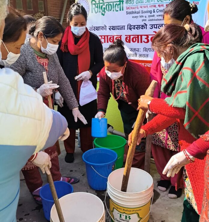 भक्तपुर, माघ ३ । सिद्धिकाली साकोस तुलाननी मध्यपुरको आयोजनामा झोल साबुन बनाउने तालिम सम्पन्न भयो | तालिममा सहभागिलाइ प्रमाणपत्र बितरन गर्दै संस्थाका अध्यक्ष वीर कृष्ण प्रजापतिले तालिम गृहणिहरुलाइ घर चलाउन सजिलो हुन्छ स साना समूह बनाइ ब्याबसाय गर्न चाहनु हुन्छ भन्ने सिद्धिकाली साकोसले शुलभ ब्याजदरमा दुई चार लाखसम्म ऋण दिन सकिन्छ भन्नू भयो | कार्यक्रम संयोजक तथा संस्थाका उपाध्यक्ष मोहन कृष्ण प्रजापतिले यो संस्थाद्वारा आयोजित पहिलो आयमुलक कार्यक्रम भएकोले व्यवहारमा प्रयोग गर्न अनुरोध गर्नु भयो | कार्यक्रममा सचिब रत्न हरि प्रजापति र प्रशिक्षक बबि मैयाँ कवांले पनि तालिमको महत्वमाथी प्रकाश पार्नु भयो कार्यक्रममा १६ जना महिला र १ जना पुरुष गरि १७ जना प्रशिक्षर्थिहरुको सहभागिता थियो