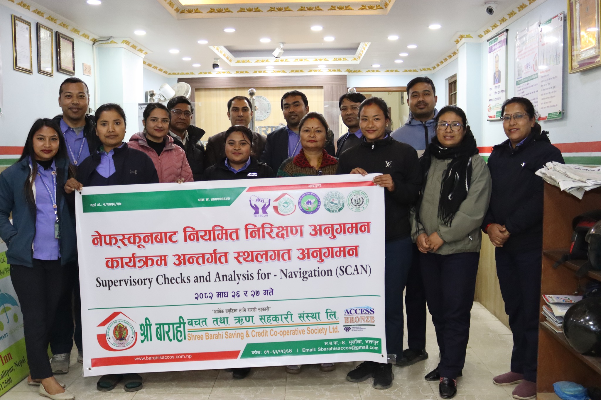 नेपाल बचत तथा ऋण केन्द्रीय सहकारी संघ लि. (नेफ्स्कून) द्वारा सञ्चालित (SCAN Supervisory Checks and Analysis for Navigation) नियमित निरिक्षण तथा अनुगमन कार्यक्रम अन्तर्गत सहकारी क्षेत्रमा सुशासन र सदस्यको बचत सुरक्षाको मुख्य चुनौतीलाई मध्यनजर गरि भक्तपुरको सुर्यविनायक भुलाँचा स्थित श्री बाराही बचत तथा ऋण सहकारी संस्था लि. मा सघन स्थलगत सुपरीवेक्षण अनुगमन तथा प्राविधिक विश्लेषण कार्य सम्पन्न भएको छ ।