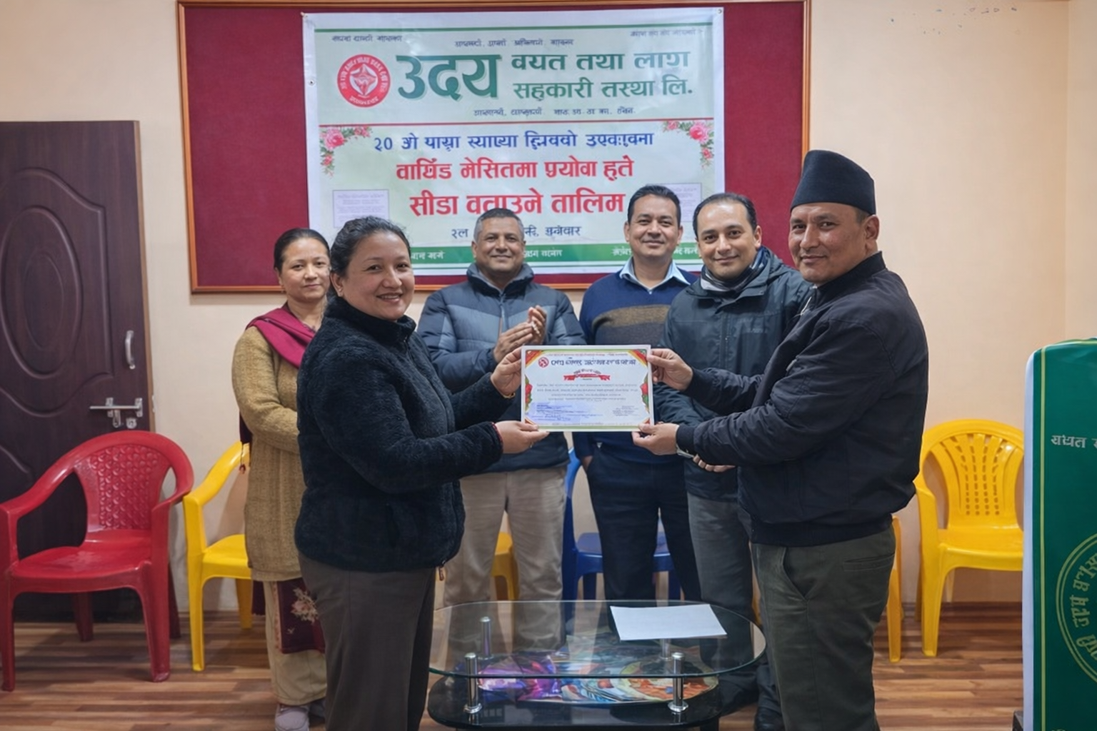 भक्तपुर, फागुन २। लिवालिवी स्थित उदय बचत तथा ऋण सहकारी संस्थाको ३० औं स्थापना दिवसको अवसरमा शुक्रबार वासिन मेसिनको सोडा बनाउने तालिम सम्पन्न गरियो । कार्यक्रममा संस्थाका कार्यबाहक अध्यक्ष तथा उपाध्यक्ष न्हुछे बहादुर प्रजापतिले समुदायमा आधारित सहकारी संस्था हुँदा समुदायको हितका लागि समुदाय लक्षित तालिमको रूपमा वासिन मेसिनको सोडा बनाउने तालिम संचालन बताउनुभयो ।