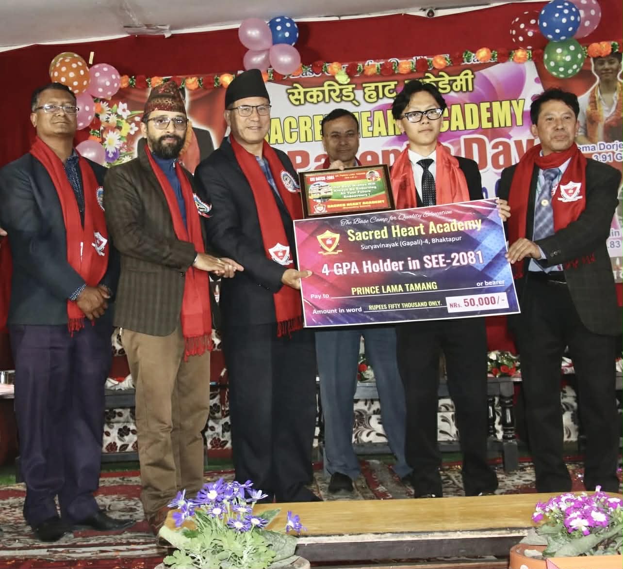 प्रमुख अतिथिले मिहिनेत, अभ्यास र अवसरले मात्र विद्यार्थीहरूलाई सफलता हासिल हुने बताउँदै अवसर पाएको खण्डमा हरेक विद्यार्थीले उत्कृष्टता हासिल गर्नसक्ने धारणा व्यक्त गर्नुभयो । उहाँले विद्यार्थीको क्षमता अनुसारको शिक्षा प्रदान गर्नसक्नु नै शिक्षकको कर्तव्य हो भन्नुभयो । एसईई परीक्षा २०८१ मा ४ जीपीए ल्याउन सफल विद्यार्थी प्रिन्स लामा लगायतका सम्पूर्ण विद्यार्थीलाई बधाई एवम् शुभकामना दिँदै नगर प्रमुख प्रजापतिले बलियो शैक्षिक जग नै विद्यार्थीको सुनिश्चित भविष्य तय गर्ने आधार भएको बताउनुभयो । विद्यालयका प्रिन्सिपल श्रीराम सुवालले एसईई २०८१ मा ४ जीपीए ल्याउन सफल विद्यार्थी प्रिन्स लामाको मनोबल बढाउन र थप हौसला प्रदान गर्न विद्यालयले रु. ५० हजारको प्रोत्साहन रकम व्यवस्था गरेको बताउनुभयो । हाल सेकरिड हार्टमा ६०० को हाराहारीमा विद्यार्थीहरू अध्ययनरत रहेको उल्लेख गर्दै उहाँले विद्यार्थीलाई किताबी ज्ञानसँगै असल संस्कारको आवश्यकता औँल्याउनुभयो ।
