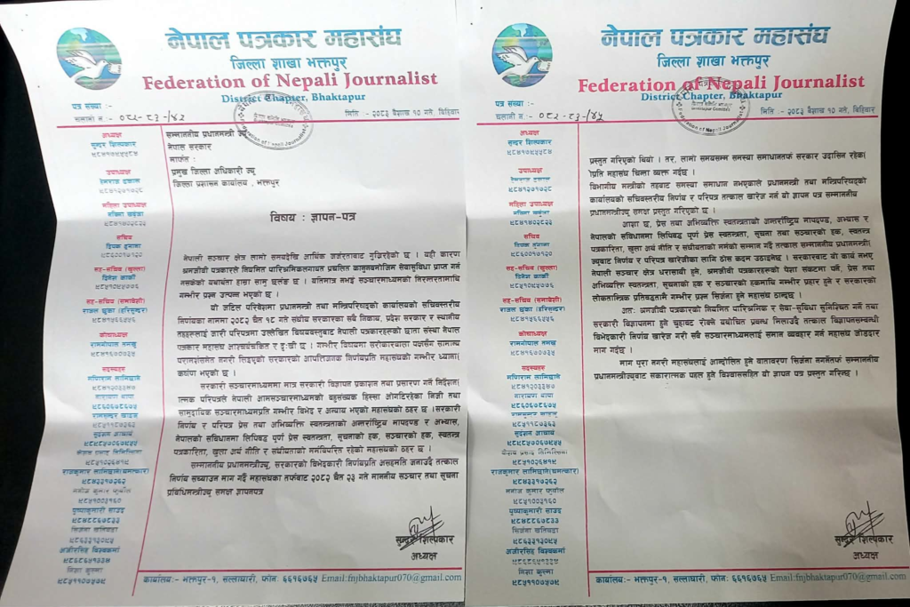 भक्तपुर, २०८३ बैशाख १० । नेपाल पत्रकार महासंघ भक्तपुरले सरकारी विज्ञापन वितरणसम्बन्धी निर्णय तत्काल सच्याउन माग गर्दै प्रधानमन्त्री बालेन साह लाई ज्ञापनपत्र बुझाएको छ।