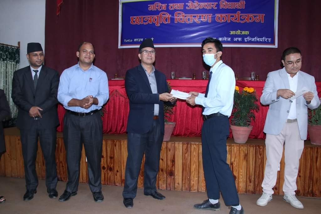 छात्रवृत्ति वितरण गर्दै भक्तपुर नगरपालिकाका प्रमुख सुनिल प्रजापतिले कलेजबाट प्रदान गरिने छात्रवृत्तिले गरिब र जेहेनदार विद्यार्थीलाई उच्च शिक्षा हासिल गर्न अवसर मिलेको बताउँदै सेमेष्टर उत्कृष्ट विद्यार्थीहरुले पनि छात्रवृत्तिमा अध्ययन गर्न पाउनु आफैमा ठूलो उपलब्धी भएको बताउनुभयो । कति विद्यार्थीहरुले झुटो विवरण बुझाएर छात्रवृत्ति लिने प्रयास भएको बताउँदै छात्रवृत्रि रकमको भरपुर सदुपयोग गरी आफ्नो अध्ययन पूरा गर्न विद्यार्थीलाई प्रेरित गर्नुभयो ।