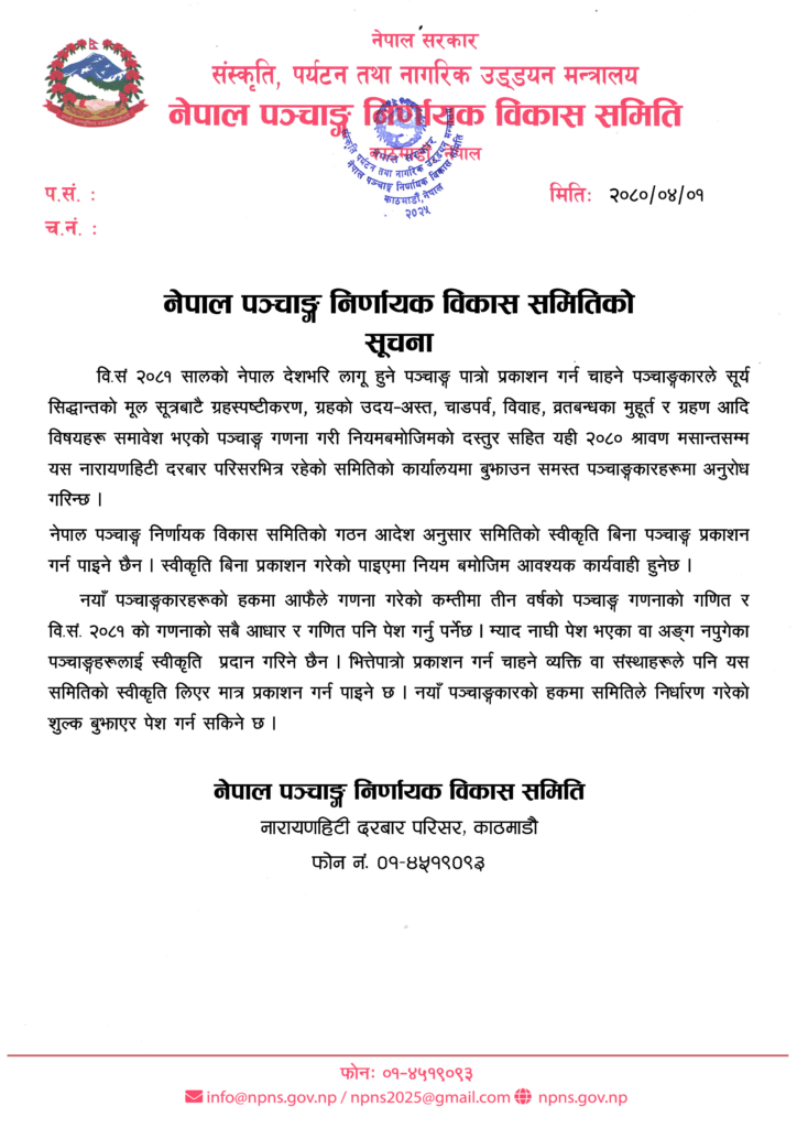 काठमाडौं- विसं २०८१ को पञ्चाङ्ग (पात्रो) प्रकाशन गर्न चाहने पञ्चाङ्गकारलाई साउन मसान्तभित्रै त्यससम्बन्धी विवरण पेस गर्न नेपाल पञ्चाङ्ग निर्णायक विकास समितिले आह्वान गरेको छ ।