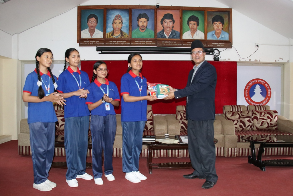विद्यार्थीहरुलाई भक्तपुर नपामा स्वागत गर्दै प्रमुख प्रजापतिले भक्तपुरको संक्षिप्त इतिहासबारे अवगत गराउँदै भक्तपुर नपाबाट सञ्चालित कलेजहरुको शैक्षिक विशेषताहरुबारे जानकारी दिनुभयो ।
